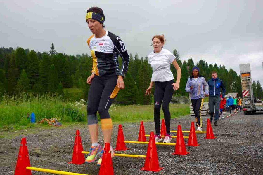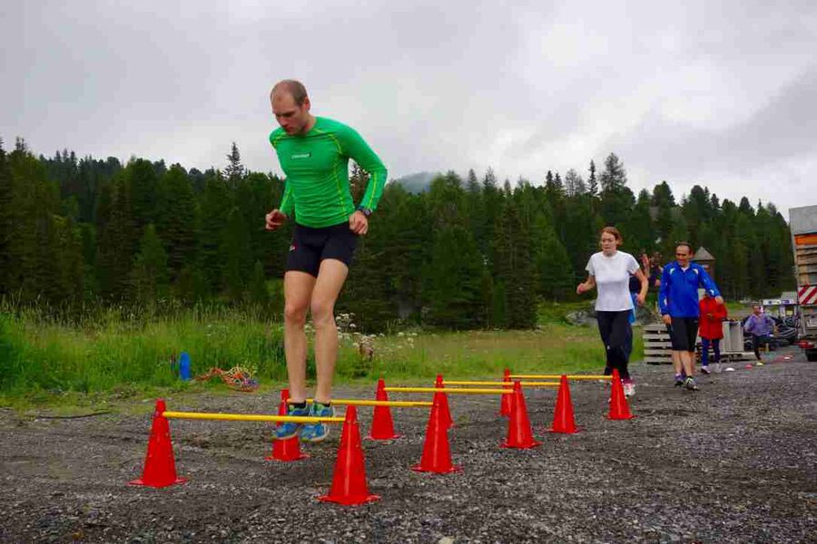 Nach dem Frühstück ist noch Zeit, sich auszuruhen, bevor um 11 Uhr die zweite Trainingseinheit startet. Unter dem Stichwort Lauftechniktraining machen wir Lauf- und Sprungübungen mit Hütchen, Hürden und Seilen. So ähnlich kenne ich das von zu Hause. Das Wetter wird schlechter. Es beginnt heftig zu regnen. Aber das hält uns nicht vom Training ab.