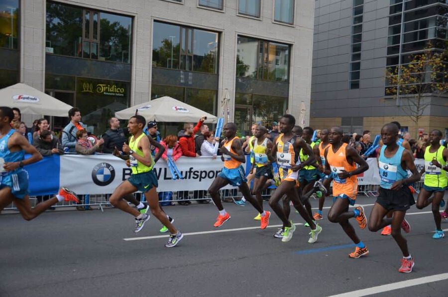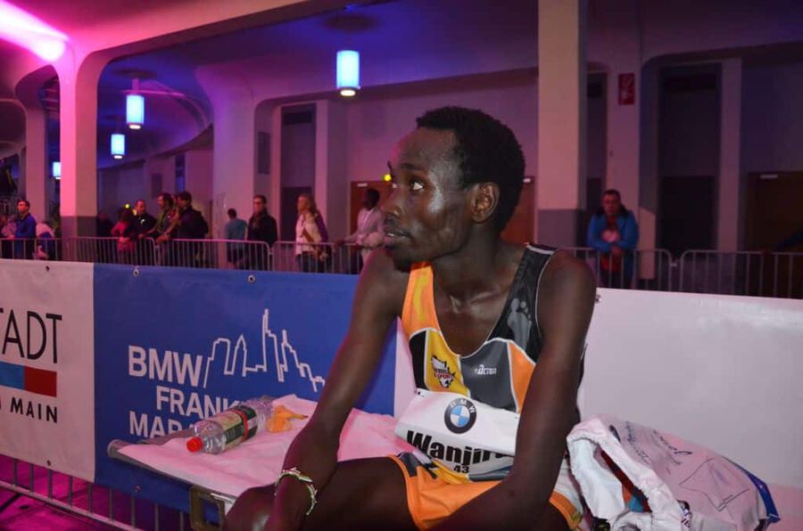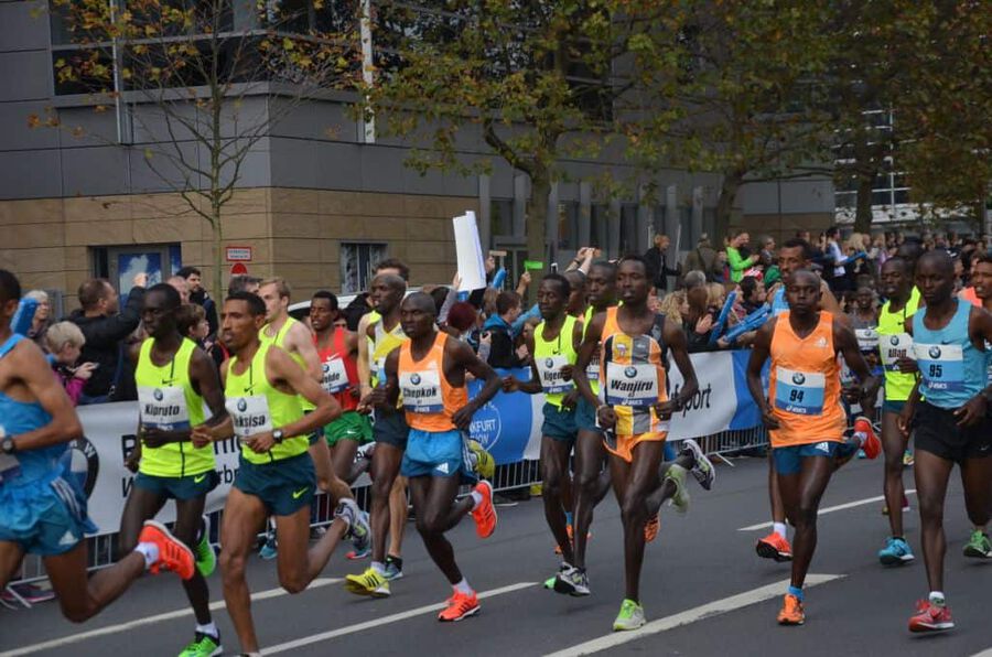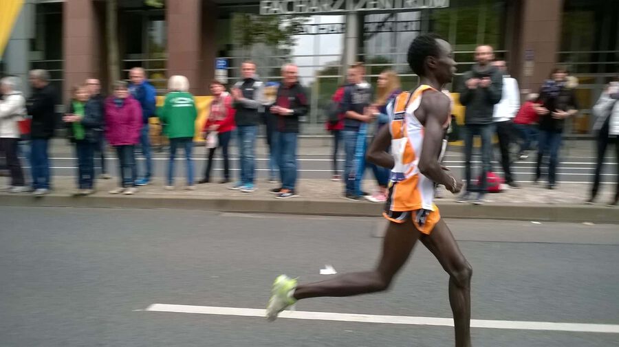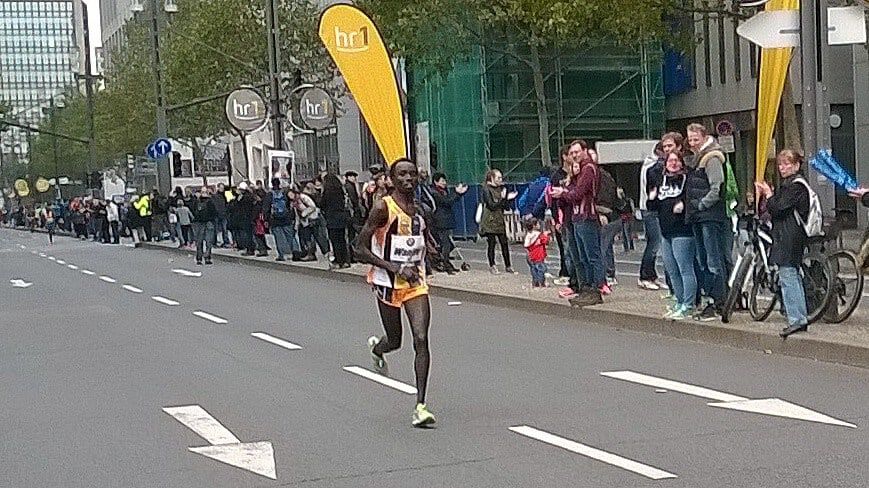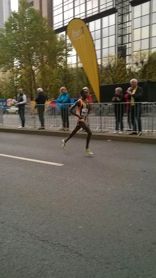 Mit einer tollen Leistung präsentiert sich Daniel Kinyua WANJIRU bei seinem Marathondebüt in Frankfurt. Gegen die absolute Weltspitze zeigt er vom Start weg ein beherztes und konzentriertes Rennen. Hält sich geschickt meist im hinteren Drittel der Führungsgruppe, die planmäßig nach 62.32 die Halbmarathondistanz passiert. Danach wird es ein Ausscheidungsrennen, bei dem die Gruppe nach und nach kleiner wird. Die Favoriten Mekonnen und Kipruto fallen zurück und schließlich bleibt eine 7 köpfige Spitze über. Bei km 35 dann vermutlich ein Fehler mit Folgen. Daniel verpasst sein Getränk, muß kurz stehen bleiben, kann es aber dennoch nicht erwischen. Er verliert dadurch nicht nur einige Meter sondern auch mental vielleicht etwas den Glauben bis zum Schluß um den Sieg mitfighten zu können. Die fehlende Flüssigkeits- und Glucosezufuhr kann natürlich auch eine Rolle gespielt haben, dass er auf den letzten 7 km doch hart zu kämpfen hatte, den Anschluß leider nicht mehr schaffte, dennoch aber souverän den tollen 7. Platz ins Ziel brachte. 2.08.18 bedeutet nicht nur ein großartiges Debüt für Daniel, sondern für unser Team auch die bisher beste Marathonzeit (bisher 2.08.32 von Geoffrey Gikuni NDUNGU in Dublin). Ebenso sehr erfreulich: bis auf Seitenstechen zwischen km 13 und 18, das er danach aber wieder in den Griff bekam, hatte er keinerlei körperliche Probleme. Seine Muskulatur verkrampfte nicht und auch sonst ist er jetzt, bereits wenige Minuten nach dem Zieleinlauf wieder relativ locker. Sicherlich auch ein Verdienst unseres Schuhpartners ON, die mit dem Cloudracer nicht nur ein extrem “schnelles” und leichtes sondern auch immer noch gut gedämpftes Modell am Markt haben.