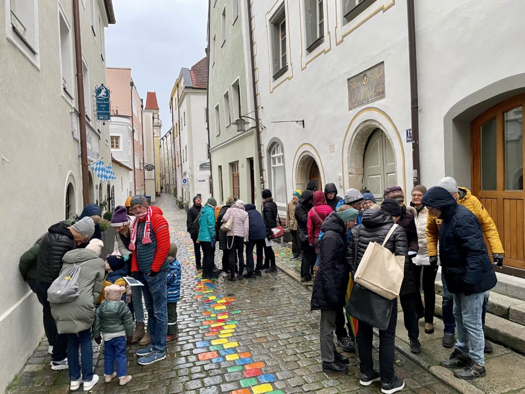 Nach einer kleinen Stärkung ging das Programm im Zentrum Passaus weiter. Die Teilnehmer wussten aus dem Programm von einer gemeinsamen Stadtführung, aber nicht, dass eine „Schnitzeljagd“ durch die Altstadt auf sie wartete. Angelehnt an Geocaching unterteilte sich unsere gut 30-köpfige Gruppe zunächst in vier selbstgewählte Kleingruppen, dann wurden wir auch schon mit einer Aufgabe losgeschickt, um den ersten Cach bzw. den ersten Schatz in der Altstadt zu finden. Im Verlauf der kommenden knapp 2 Stunden konnten sich die Gruppen mit dem Auffinden der Schätze, mit dem Lösen kleiner Wissensrätseln und vor allem mit ganz viel Spaß Punkte verdienen. Die drei Erstplatzierten erhielten am Ende eine kleine Überraschung. Eine heitere und unterhaltsame Art und Weise für Alt und Jung, um die Geschichte Passaus ein wenig kennenzulernen.