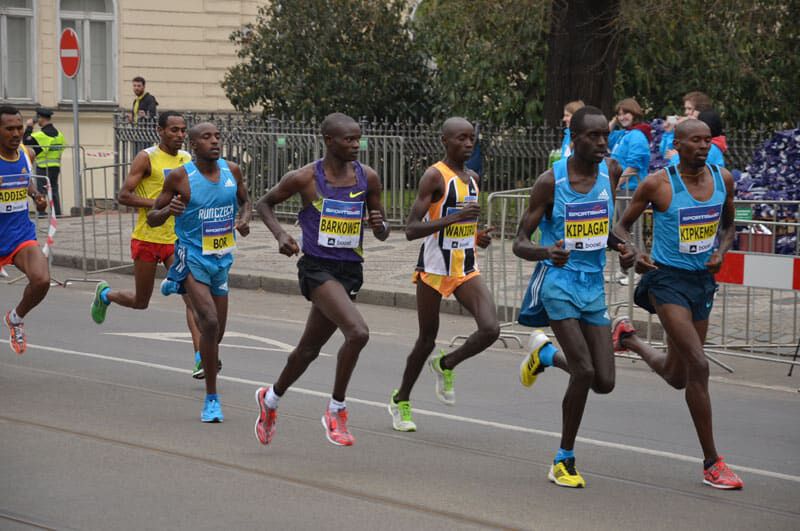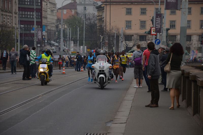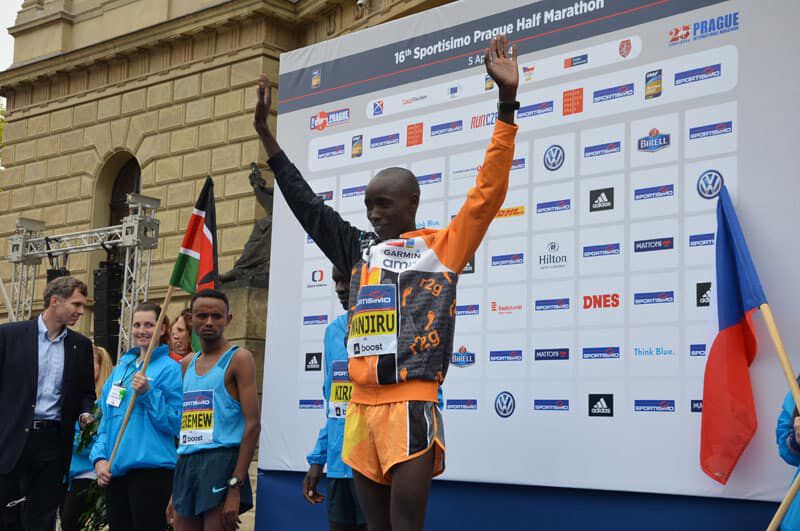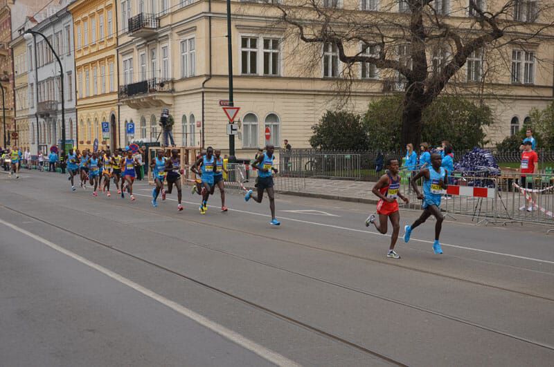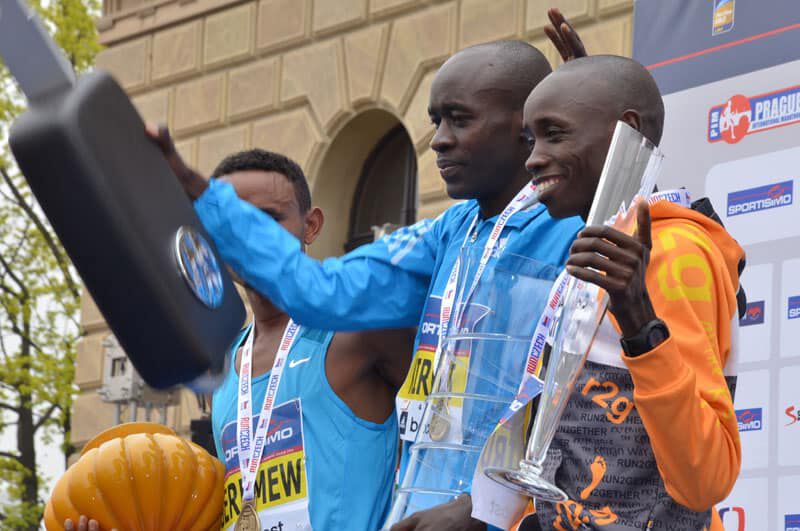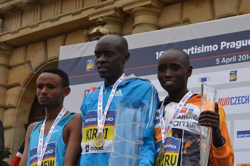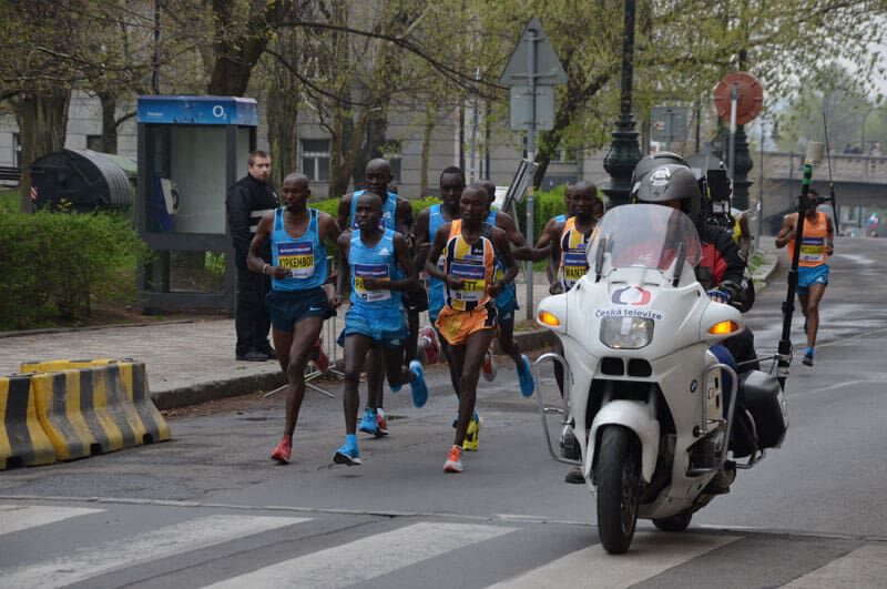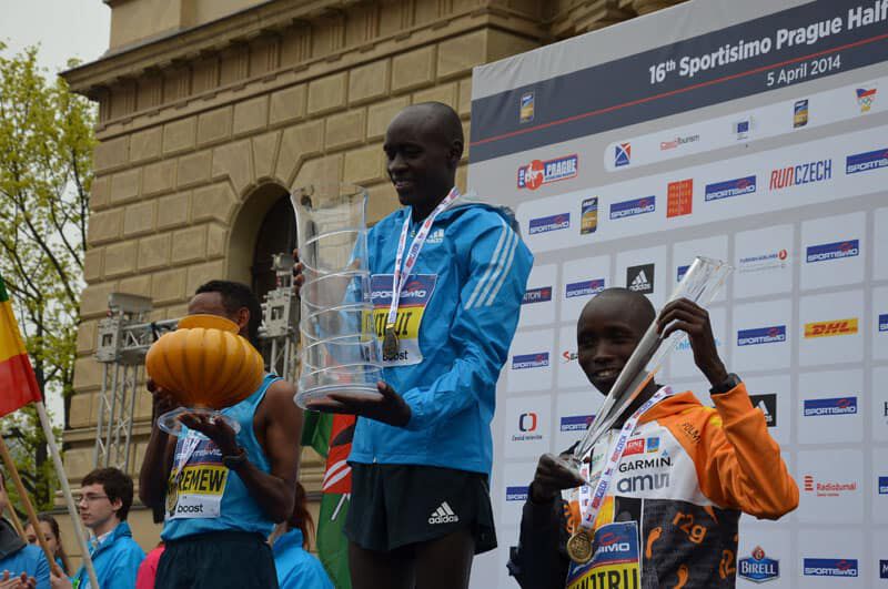 Um Punkt 12Uhr fiel der Startschuß in Prag und knapp 13.000 Läufer machten sich in Bewegung. Bei der Elite bedeutet „sich in Bewegung setzen“ in diesem Fall einen ersten Kilometer in 2.46 zu bewältigen. Sprich das Tempo war vom Start weg wie gewohnt in Prag enorm hoch. Ein sehr großes Elitefeld mit knapp 20 afrikanischen Athleten begeisterte die vielen Tausend Zuschauer am Streckenrand. Daniel und Benard liefen in der Spitzengruppe, die 5km passierten sie in 13.57, die 10km in 28.07. Einer der großen Favoriten, Peter Kirui forcierte bei km 13 an einer Verpflegsstation und schnell öffnete sich eine Lücke. In der 4 köpfigen Verfolgergruppe unser Daniel und wenige Meter dahinter Benard. Immer wieder wurde aufs Tempo gedrückt und die vielen Unterführungen, Brücken und Kopfsteinpflasterpassagen verlangten den Athleten alles ab. Daniel war es, der bei km 18 einen Vorstoß aus der Verfolgergruppe wagte und nur der Äthiopier Geremew konnte folgen. Auf den letzten Kilometern stand der Sieg von Peter Kirui bereits fest und er lief souverän in 59.22 zum verdienten Sieg. Dahinter aber ein spannender Kampf um die Podiumsplätze. Daniel gab alles und finishte in beeindruckender neuer persönlicher Bestzeit von 59.58 auf Platz 3, nur 5 Sekunden hinter dem Zweitplatzierten und mit 13 Sekunden Vorsprung auf seinen Verfolger. Eine wirklich mehr als überzeugende Leistung die uns alle und besonders ihn selbst irrsinnig glücklich macht. Bei seinem dritten Start in Prag und nach kontinuierlicher Verbesserung in den letzten Jahren (er steigerte sich von 62min 2012 nun auf 59min)konnte er sein schon oft angedeutetes und auch gezeigtes Potenzial richtig ausspielen. Ein Vorzeige-Athlet in jeder Hinsicht, der sich und uns allen noch viel Freude bereiten wird und eine große Karriere vor sich hat (immerhin ist er erst 22 Jahre alt)!