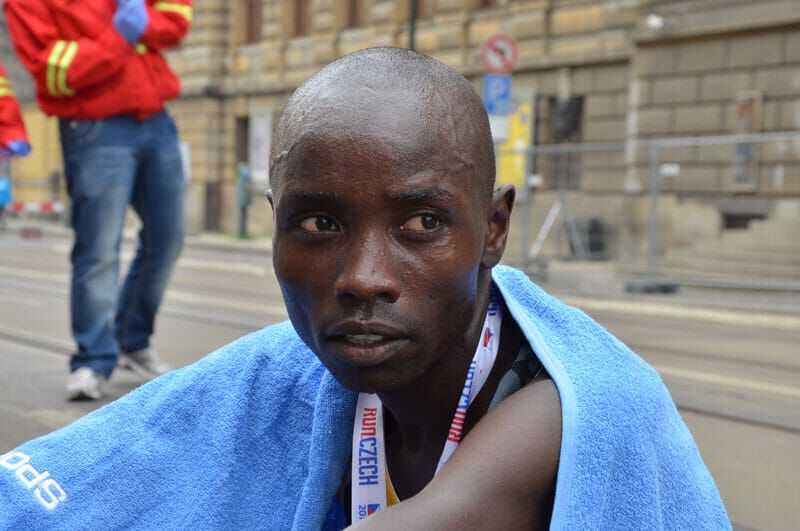 Um Punkt 12Uhr fiel der Startschuß in Prag und knapp 13.000 Läufer machten sich in Bewegung. Bei der Elite bedeutet “sich in Bewegung setzen” in diesem Fall einen ersten Kilometer in 2.46 zu bewältigen. Sprich das Tempo war vom Start weg wie gewohnt in Prag enorm hoch. Ein sehr großes Elitefeld mit knapp 20 afrikanischen Athleten begeisterte die vielen Tausend Zuschauer am Streckenrand. Daniel und Benard liefen in der Spitzengruppe, die 5km passierten sie in 13.57, die 10km in 28.07. Einer der großen Favoriten, Peter Kirui forcierte bei km 13 an einer Verpflegsstation und schnell öffnete sich eine Lücke. In der 4 köpfigen Verfolgergruppe unser Daniel und wenige Meter dahinter Benard. Immer wieder wurde aufs Tempo gedrückt und die vielen Unterführungen, Brücken und Kopfsteinpflasterpassagen verlangten den Athleten alles ab. Daniel war es, der bei km 18 einen Vorstoß aus der Verfolgergruppe wagte und nur der Äthiopier Geremew konnte folgen. Auf den letzten Kilometern stand der Sieg von Peter Kirui bereits fest und er lief souverän in 59.22 zum verdienten Sieg. Dahinter aber ein spannender Kampf um die Podiumsplätze. Daniel gab alles und finishte in beeindruckender neuer persönlicher Bestzeit von 59.58 auf Platz 3, nur 5 Sekunden hinter dem Zweitplatzierten und mit 13 Sekunden Vorsprung auf seinen Verfolger. Eine wirklich mehr als überzeugende Leistung die uns alle und besonders ihn selbst irrsinnig glücklich macht. Bei seinem dritten Start in Prag und nach kontinuierlicher Verbesserung in den letzten Jahren (er steigerte sich von 62min 2012 nun auf 59min)konnte er sein schon oft angedeutetes und auch gezeigtes Potenzial richtig ausspielen. Ein Vorzeige-Athlet in jeder Hinsicht, der sich und uns allen noch viel Freude bereiten wird und eine große Karriere vor sich hat (immerhin ist er erst 22 Jahre alt)!