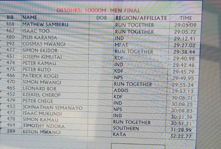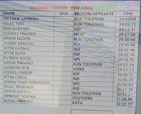 Welchen Stellenwert und Dichte der Laufsport in Kenia hat, zeigt auch die Startliste in Nairobi. 54(!) Läufer waren für die 10.000m bei den Herren in drei Läufen gemeldet.
