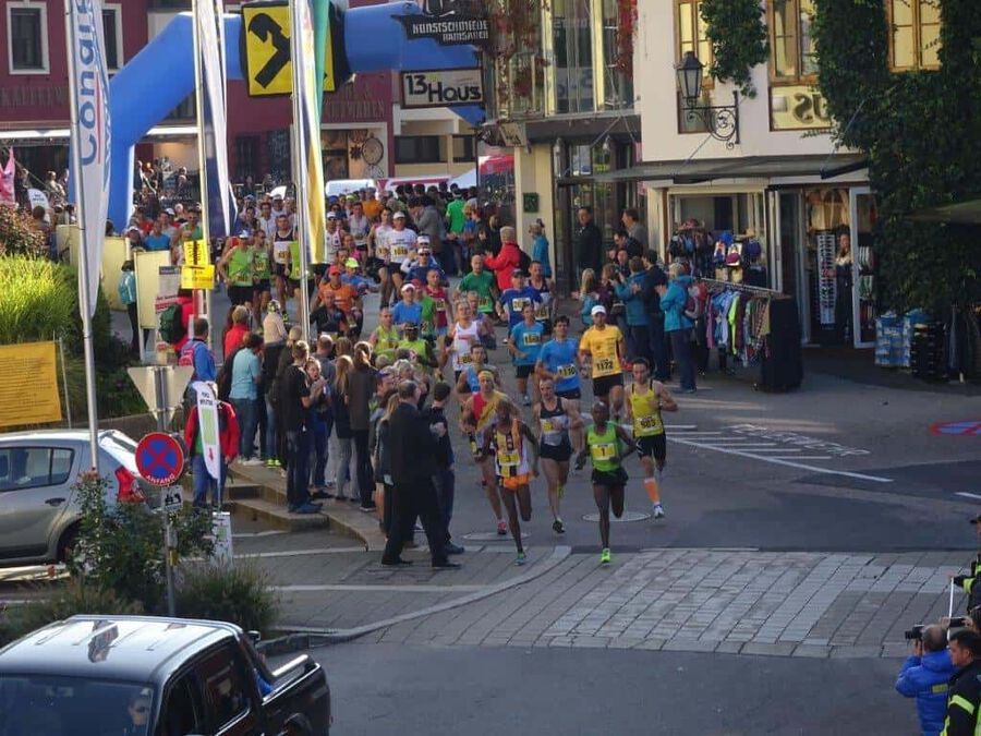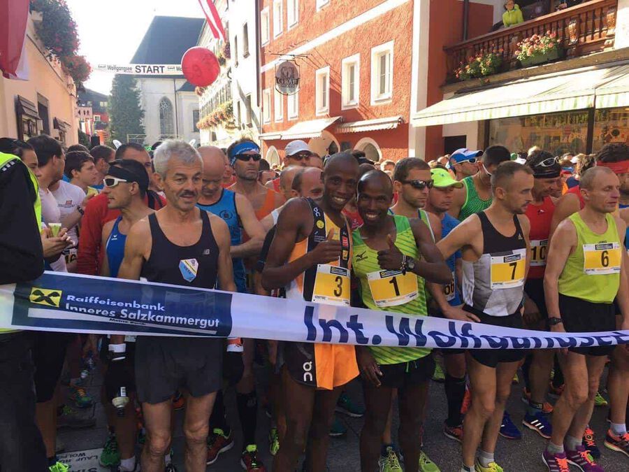 Dennis Kipkorir RUTOH beim Klassiker über die 27 Km Strecke vertreten, an seiner Seite an der Startlinie standen der Mehrfachsieger und Streckenrekordhalter Hosea TUEI (Kenia), der diesen Kurs bei seinem nun 9. Antreten wohl bestens kennt und der ehemalige run2gether Läufer Isaac Toroitich KOSGEI. Nach dem Start in St. Wolfgang bildeten diese drei eine starke Führungsspitze. Nach rund 3 Km führt der Streckenverlauf über einen 220 Hm steilen Anstieg bergauf zur Kapelle auf den Falkenstein, den man in knapp 2 km bewältigen musste, bevor es steil bergab wieder hinunter zum Wolfgangsee ging. Dann verlief die wellige Strecke zumeist am Seeufer entlang bis zum Ziel in St. Wolfgang.