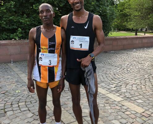 Nach unserem ersten Antreten 2019 konnten wir dieses Jahr Joel Kipkenei MELLY und Simon WAITHIRA nach Aschaffenburg in Unterfranken entsenden. Die Strecke führte die Läufer am vergangenen Freitag in fünf Runden à 1.600m über insgesamt 8 Km durch die Stadt. Bei heißen Temperaturen und böigem Wind wurde der Lauf abends gestartet. Trotz der späteren Startzeit zeigte das Thermometer immer noch 29 Grad. Ein Baustellenbereich mit Schotterauflage veränderte zudem den Streckenverlauf, der im Vergleich zu den Vorjahren, die Strecke etwas verlängerte.