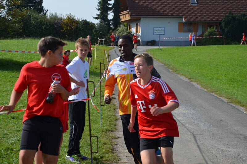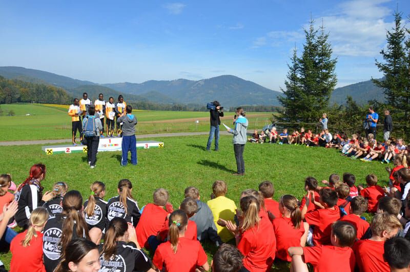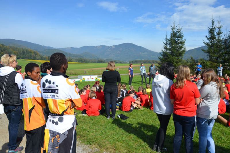 Nach einer Vorstellungsrunde und anschließenden Frage/Antwortstunde im Foyer der Schule mit unseren 5 Athleten und über 200 Kindern ging es bei Sonnenschein und fast sommerlichen Temperaturen hinauf zur Laufstrecke in Landscha. Nach Altersstufen unterteilt wurden dann die Kinder auf die Strecke geschickt. Auf den ersten Metern von unseren kenianischen Athleten gebremst und im schnell zu laufenden zweiten Teil dementsprechend motiviert und unterstützt bewältigten alle Kinder die aufgrund der Steigung nicht ganz einfache Strecke in beeindruckenden Zeiten. Nicht nur die Teilnahme unserer Athleten war besonderer Ansporn sondern auch die Chance sich für den überregionalen Laufbewerb kommende Woche am Stubenbergsee zu qualifizieren. Quasi als Draufgabe war auch der ORF mit einem Kamerateam vor Ort filmte diese gelungene Veranstaltung.