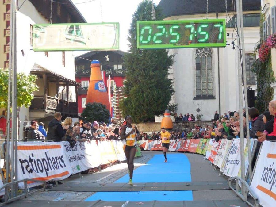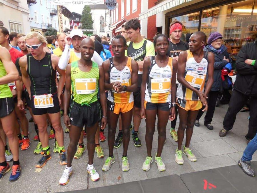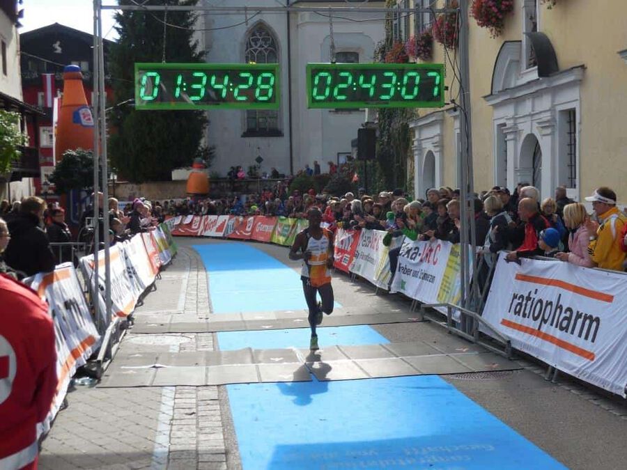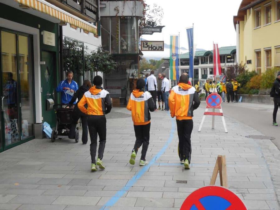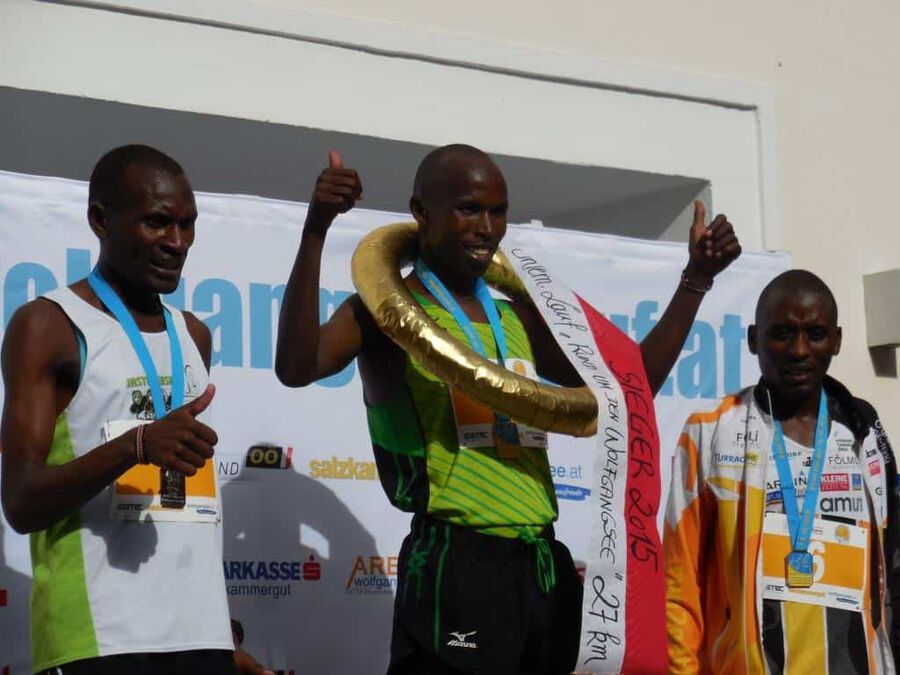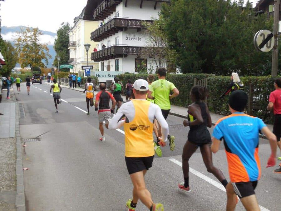 Aber dann … nach rund eineinhalb Stunden sollte es ernst werden. Eine günstige Position für das Siegerfoto wird gesucht. Und dann … er biegt um die letzte Kurve … was heißt er? … sie biegen um die letzte Kurve … zwei Läufer matchen sich dramatisch um die begehrte Siegertrophäe in Form eines weißen Rosses sprich das ” Weiße Rössl” … und … leider … Hosea Tuei, der Langzeitsieger gewinnt ein siebentes Mal mit einer Zeit von 1:30:30! Mit einem denkbar knappen Vorsprung vor … leider nicht einem Läufer unseres Teams. An Position 3 folgt dann Edwin mit einer Zeit von 1:31:03 und einem Rückstand von nur 31 Sekunden, gezeichnet von dem harten Lauf und noch härterem Finish. Bis km 26 konnte er mit den beiden in der Spitzengruppe mithalten, aber als diese den Zielsprint anzogen, fehlten ihm die entscheidenden Körner. Trotzdem ” Well done!” Unser Moses beendet das Rennen mit einer Zeit von 1:34:27 an der sechsten Position. Der steile Anstieg zum Falkenstein mit rd. 200 HM und noch steilere Abstieg ließen eine alte Verletzung wieder hervortreten, diese begleitete ihn das ganze Rennen.