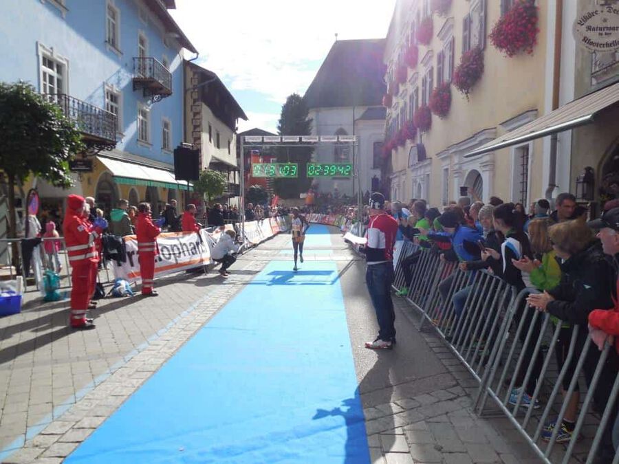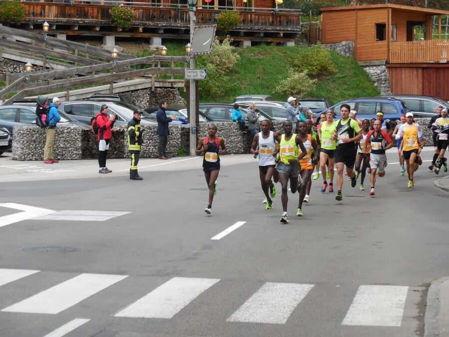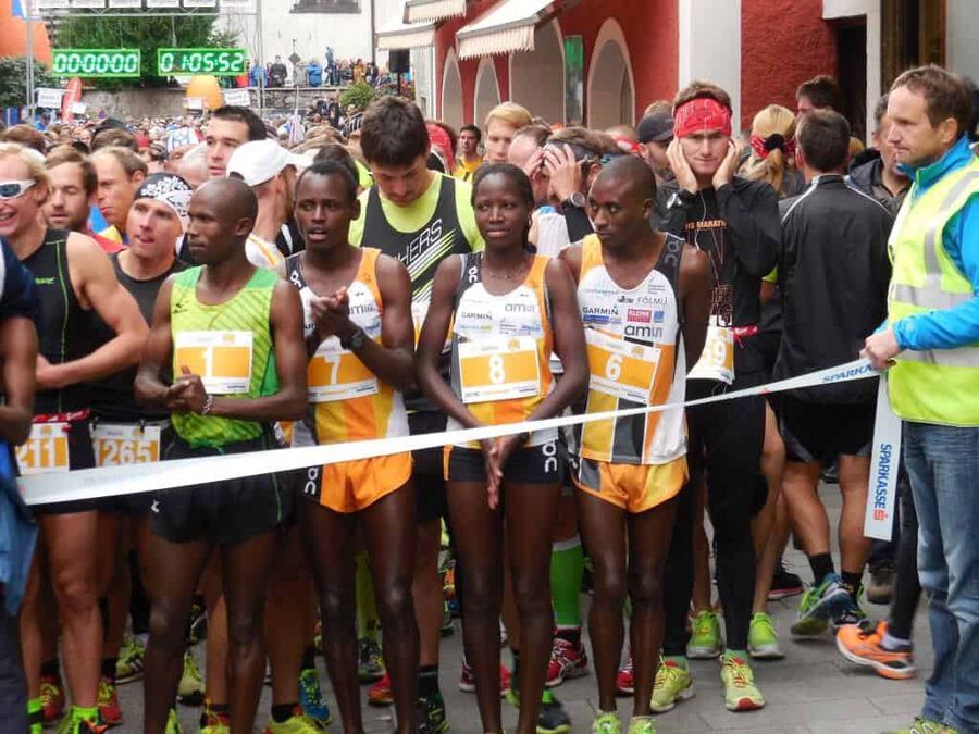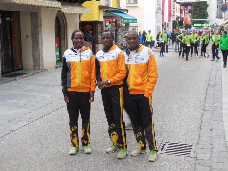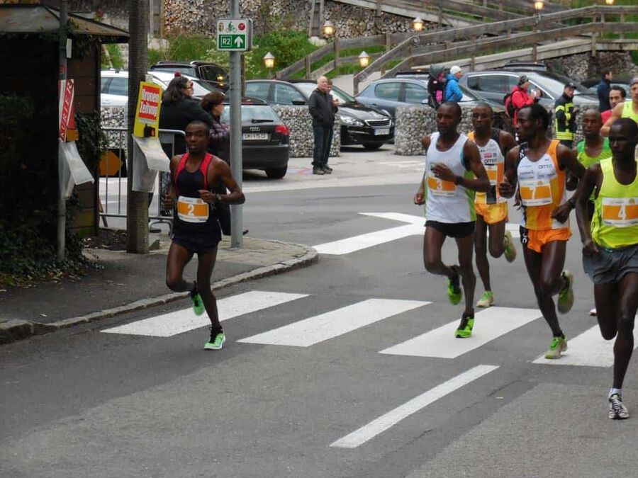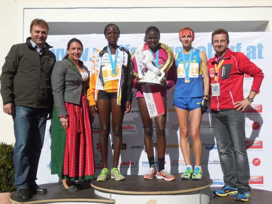 Aber dann … nach rund eineinhalb Stunden sollte es ernst werden. Eine günstige Position für das Siegerfoto wird gesucht. Und dann … er biegt um die letzte Kurve … was heißt er? … sie biegen um die letzte Kurve … zwei Läufer matchen sich dramatisch um die begehrte Siegertrophäe in Form eines weißen Rosses sprich das ” Weiße Rössl” … und … leider … Hosea Tuei, der Langzeitsieger gewinnt ein siebentes Mal mit einer Zeit von 1:30:30! Mit einem denkbar knappen Vorsprung vor … leider nicht einem Läufer unseres Teams. An Position 3 folgt dann Edwin mit einer Zeit von 1:31:03 und einem Rückstand von nur 31 Sekunden, gezeichnet von dem harten Lauf und noch härterem Finish. Bis km 26 konnte er mit den beiden in der Spitzengruppe mithalten, aber als diese den Zielsprint anzogen, fehlten ihm die entscheidenden Körner. Trotzdem ” Well done!” Unser Moses beendet das Rennen mit einer Zeit von 1:34:27 an der sechsten Position. Der steile Anstieg zum Falkenstein mit rd. 200 HM und noch steilere Abstieg ließen eine alte Verletzung wieder hervortreten, diese begleitete ihn das ganze Rennen.