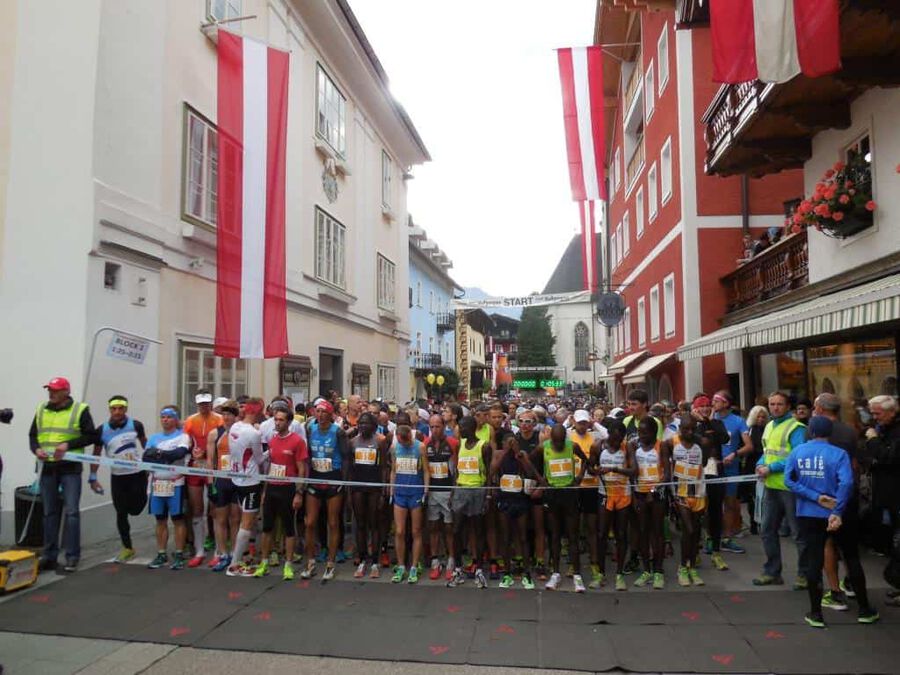 Eines, was beim Wolfgangsee zu beanstanden ist, der Betreuer leidet neben der Tätigkeit des Mitfieberns total an Langeweile! Warum? Der Start des Rennens ist punkt 10:30 Uhr. Unsere 3 Läufer Edwin KIPKORIR, Moses Wagura WAMAITHA und Pauline Eapan machen sich mit 5 anderen Kenianern und einem Pulk von knapp 2.000 Hobbyläufern auf den Weg. Es ist eine Distanz von 27 km rund um den schönen Wolfgangsee zu absolvieren. Ein Startfoto ist schnell gemacht, danach kommt …. nix mehr. Weil eben rund um den See … damit gibt es keine zweite Begegnung. Erst die im Ziel. Bis dahin mitzittern, was das Zeug hält. Die Infos von der Strecke sind eher spärlich. Herumgehen, Läufer diverser anderer Bewerbe (5km, 10 km und Marathon) anfeuern, aber sonst einfach nur warten.