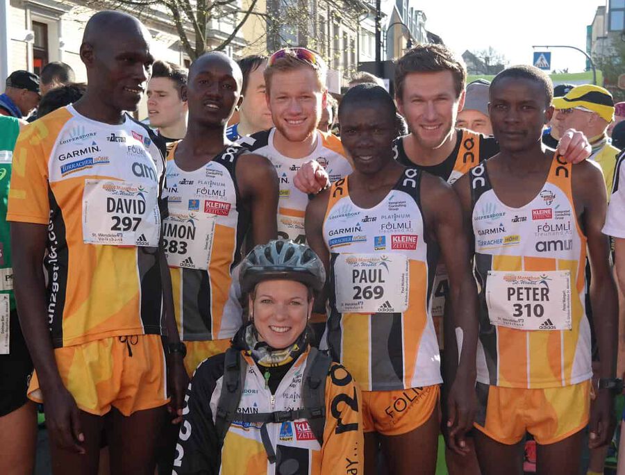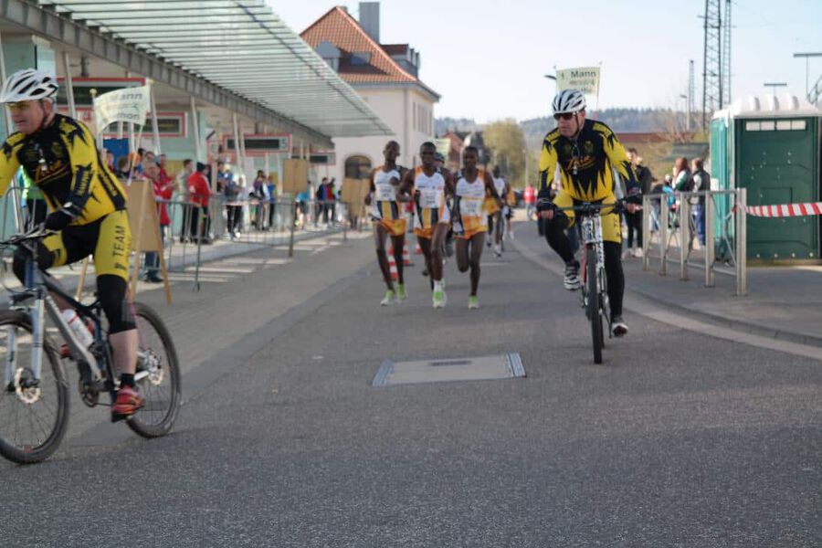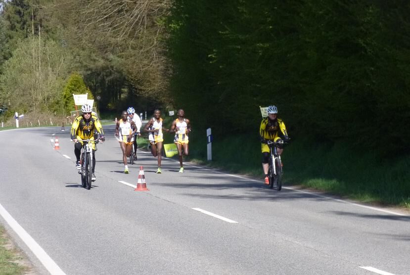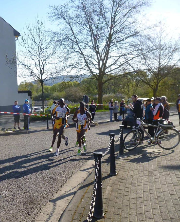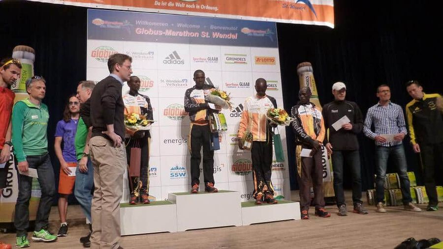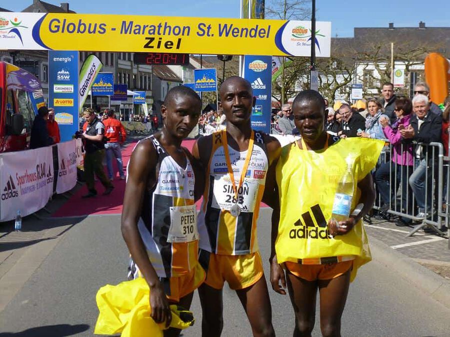 Nebst den noch auf der Marathondistanz noch recht unerfahrenen Peter Chege Wangari (Marathondebüt in Europa!) und Simon Kamau Njeri , traten außerdem noch der bereits mehrfach in St.Wendel gestartete David Sang, sowie als Favorit unser letztjähriger Jungrau-Marathonsieger Paul Maticha Michieka an die Startlinie. Bei eigentlich angenehmen Temperaturen sollte es aber aufgrund des immer stärker werdenden Windes und der doch teils ziemlich profilierten Strecke, kein leichtes Rennen werden. Schön war gerade deshalb jedoch zu beobachten, dass unsere Athleten sich gestern als echte Teamplayer präsentierten und prima zusammenarbeiteten. So führte Sang die Gruppe als Pacemaker über die ersten 10km ehe er das Zepter seinen jüngeren Kollegen übergab. Diese wechselten sich in der Führungsarbeit fortan gleichmäßig ab und Chege, Paul und Simon konnten gemeinsam in toller Zeit die Halbmarathonmarke überqueren. In der Folge war es jedoch nicht leicht das Tempo aufrecht zu halten und gerade Simon hatte mit den Bedingungen bei immer stärker werdendem Wind doch ein wenig zu kämpfen. Immer mehr kristallisierte sich überraschend unser Debütant Chege in der Folge als stärkster Mann heraus und er konnte sich einige Sekunden absetzen! Es war der Zeitpunkt gekommen an dem es für jeden darum ging für sich selbst und um seine Platzierung zu kämpfen und dies taten alle drei bravourös sowie mit großem Kampfgeist! Gerade Simon wollte sich auch noch bei km 35 keineswegs mit dem ihm ” drohenden” 3.Platz abfinden und konnte sich trotz immer schwerer werdenden Beinen stets in Sichtweite zur Spitze halten. Während es dann bei km 40 so aussah als ob Chege tatsächlich seinem ersten Marathonsieg entgegeneilen könnte, kam der Moment in dem Paul seine ganze Erfahrung und über die Jahre gesammelte Rennhärte ausspielte. Mit unheimlichen schnellen letzten Kilometern war es ihm zuerst möglich wieder zum Führenden aufzuschließen um ihn anschließend tatsächlich, nach einem packenden Kampf auf dem letzten Kilometer noch hinter sich zu lassen! Eine tolle Leistung von Paul und eine grandiose Show für die begeisterten Zuschauer in St.Wendel! Auch Chege konnte nach einem kurzen Moment des Grämens sich über seinen 2.Platz freuen und wir wollen den nicht weit vom Spitzenduo entfernten drittplatzierten Simon nicht beim Aussprechen des Lobes vergessen! Eine wirklich schöne Leistung unserer Athleten auch wenn die erwünschten Zeiten, auch ob der schwierigen äußeren Bedingungen, leider verfehlt wurden.