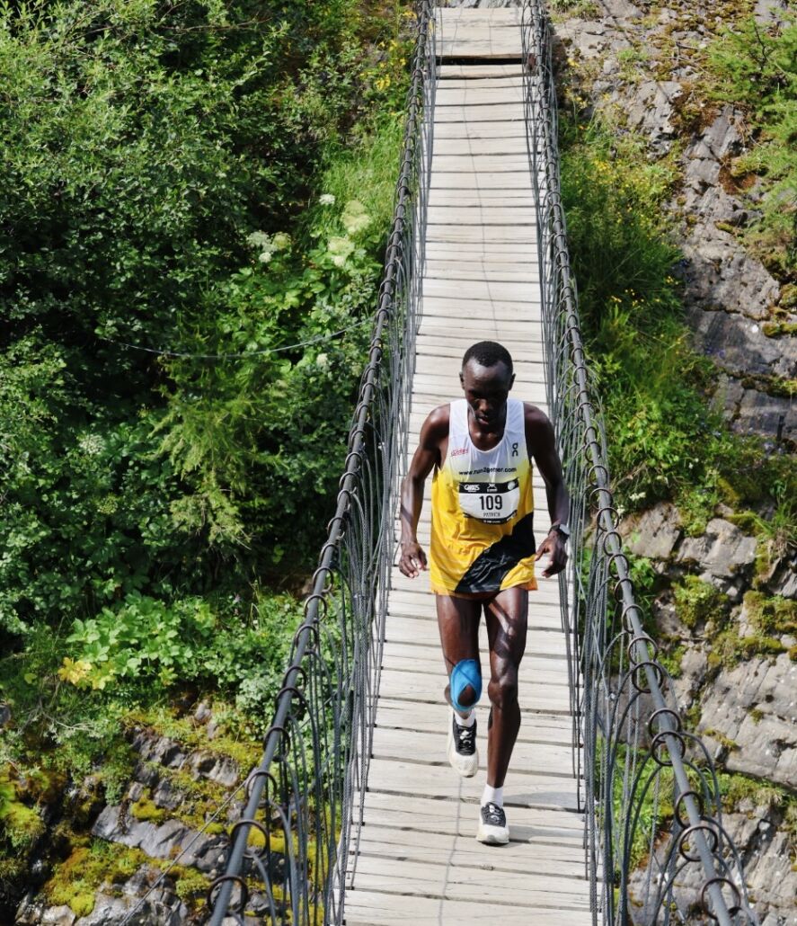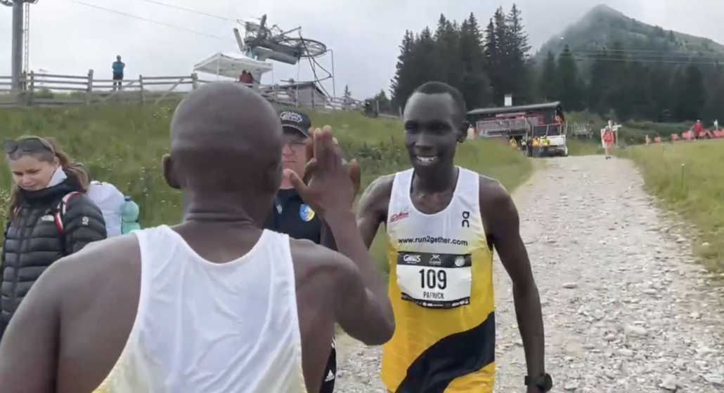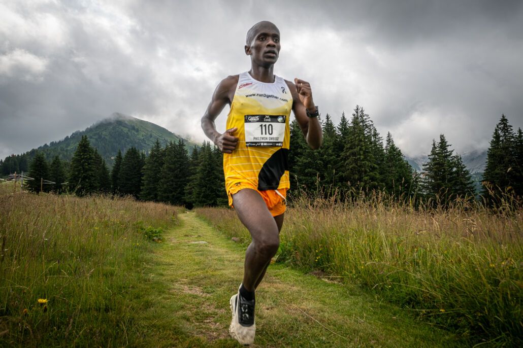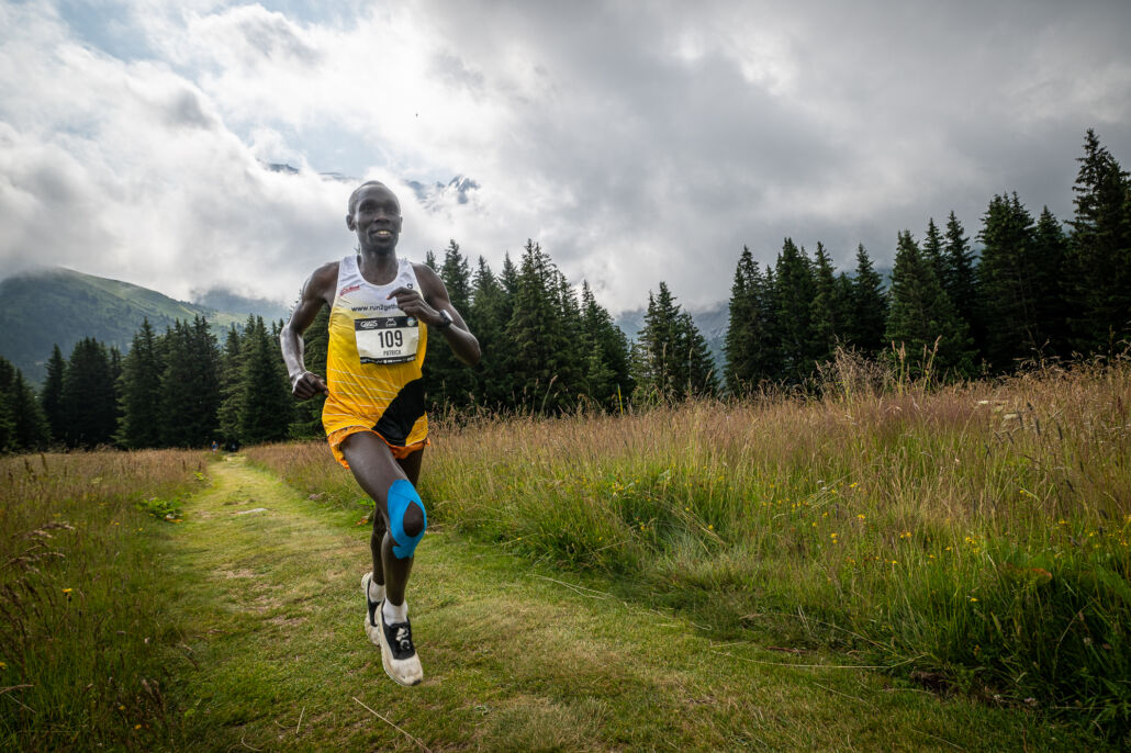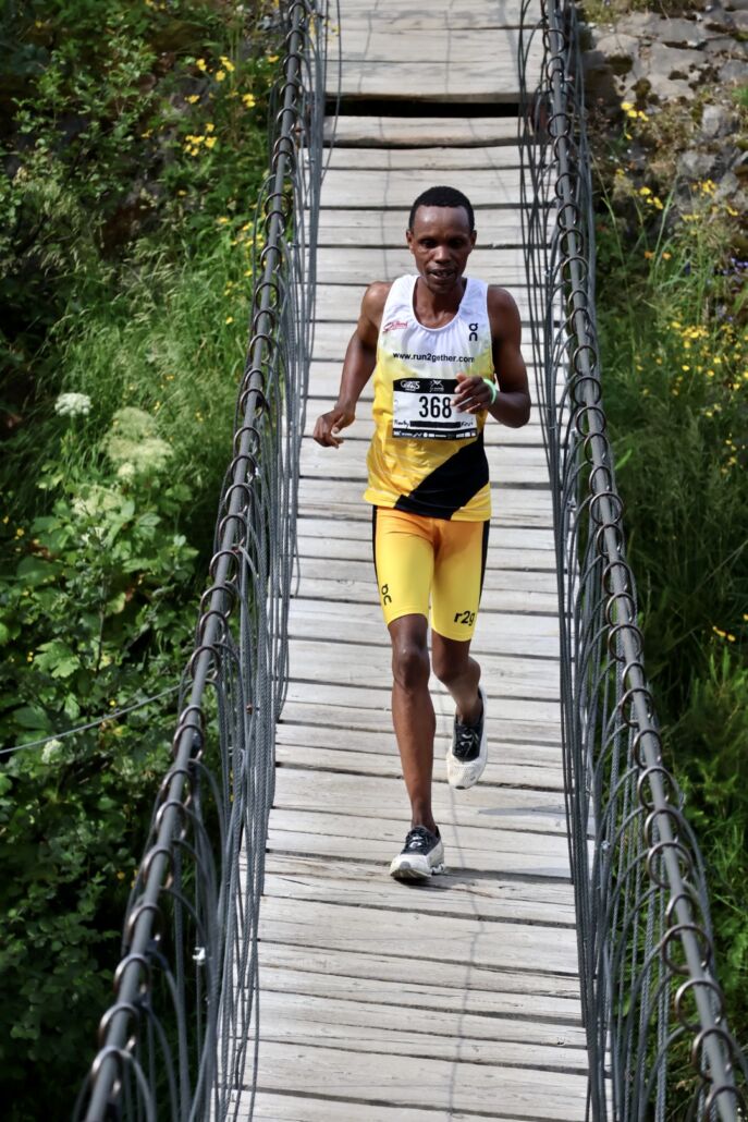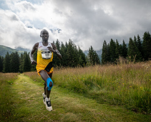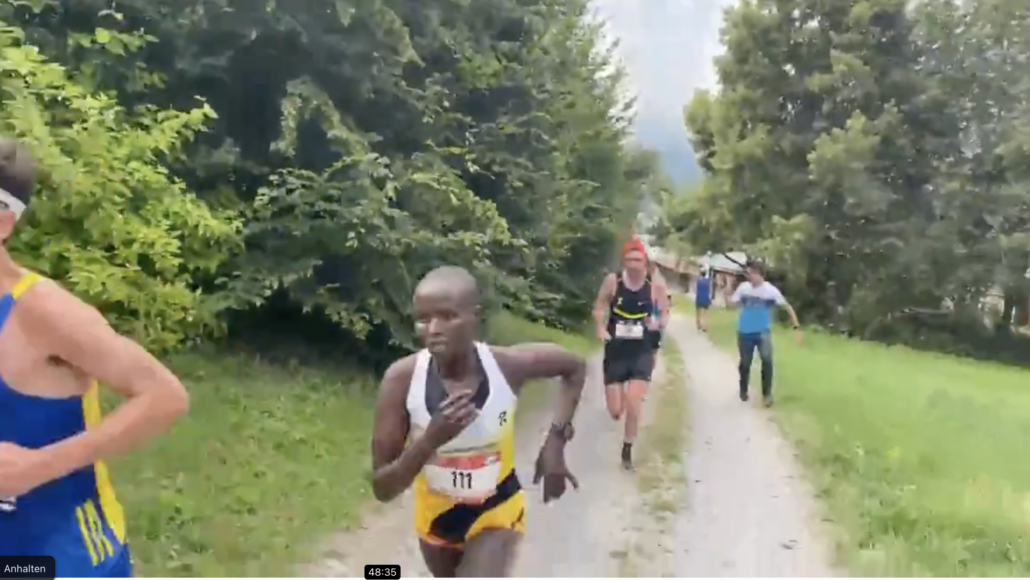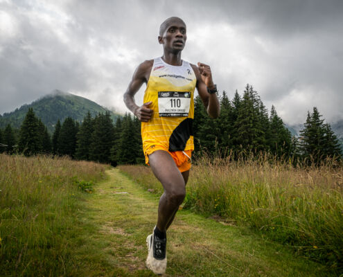 Samstag früh um 9.00 ging es auf die Strecke. Patrick, Philemon und Timothy setzten sich sofort nach dem Startschuss an die Spitze und legten gleich mit einem Höllentempo vor. Nach den ersten zwei flachen Km waren Patrick und Philemon gleich auf und davon, Timothy mit etwas Abstand dahinter. Doch auch die Zweisamkeit an der Spitze war nicht von langer Dauer, denn Patrick setzte sich schon vor dem ersten Steilstück von seinem starken Teamkollegen ab. Mit getapten Knie – Patrick musste seine Teilnahme aufgrund von Knieschmerzen beim Fletta Trail letzten Sonntag kurzfristig absagen – lief er in unglaublicher Leichtigkeit bergauf, wie bergab einem ungefährdeten Start-Ziel-Sieg entgegen. Nach der Hälfte der Strecke betrug sein Vorsprung schon mehr als 2 Minuten auf Philemon, der sich auch bis ins Ziel halten sollte. Patrick erreichte das Ziel auf knapp 2.400m Seehöhe überlegen als Erster. Zwei Minuten später überquerte Philemon als ungefährdeter Zweiter die Ziellinie. Timothy konnte sich bis KM 11 auf dem dritten Platz halten, aber der zweite, gefühlt endlos steile Anstieg zum Refuge du Nid d’Aigle kostete ihm den Platz am Podest. Er wurde schließlich nur Achter.