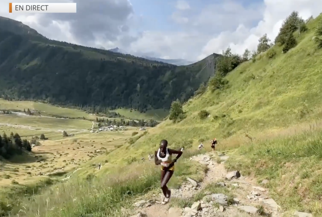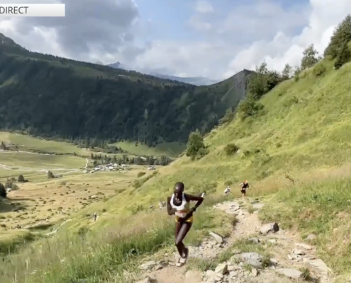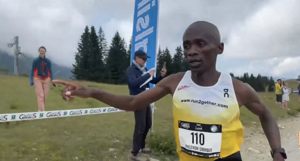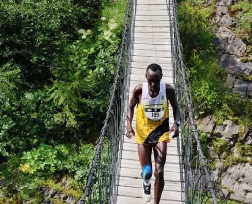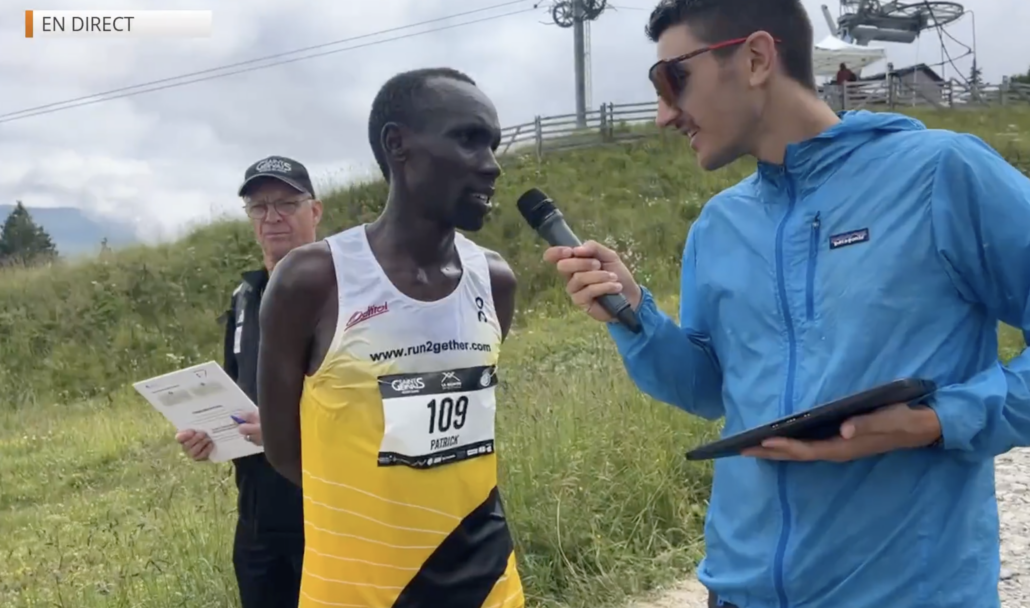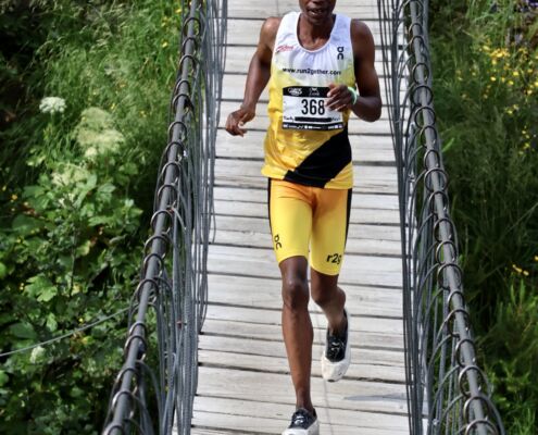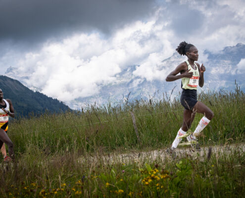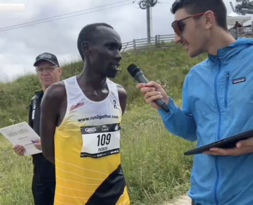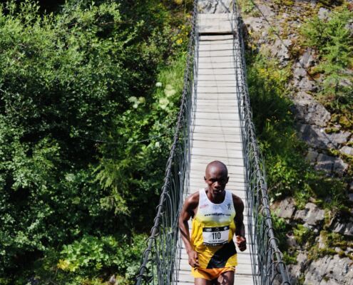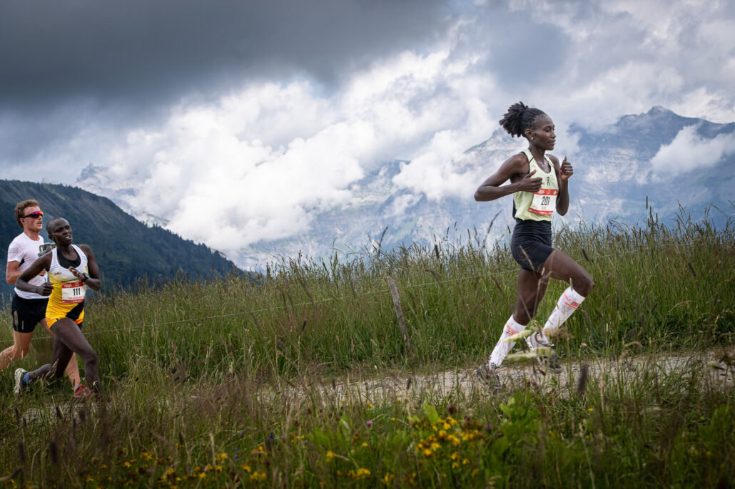 Samstag früh um 9.00 ging es auf die Strecke. Patrick, Philemon und Timothy setzten sich sofort nach dem Startschuss an die Spitze und legten gleich mit einem Höllentempo vor. Nach den ersten zwei flachen Km waren Patrick und Philemon gleich auf und davon, Timothy mit etwas Abstand dahinter. Doch auch die Zweisamkeit an der Spitze war nicht von langer Dauer, denn Patrick setzte sich schon vor dem ersten Steilstück von seinem starken Teamkollegen ab. Mit getapten Knie – Patrick musste seine Teilnahme aufgrund von Knieschmerzen beim Fletta Trail letzten Sonntag kurzfristig absagen – lief er in unglaublicher Leichtigkeit bergauf, wie bergab einem ungefährdeten Start-Ziel-Sieg entgegen. Nach der Hälfte der Strecke betrug sein Vorsprung schon mehr als 2 Minuten auf Philemon, der sich auch bis ins Ziel halten sollte. Patrick erreichte das Ziel auf knapp 2.400m Seehöhe überlegen als Erster. Zwei Minuten später überquerte Philemon als ungefährdeter Zweiter die Ziellinie. Timothy konnte sich bis KM 11 auf dem dritten Platz halten, aber der zweite, gefühlt endlos steile Anstieg zum Refuge du Nid d’Aigle kostete ihm den Platz am Podest. Er wurde schließlich nur Achter.
