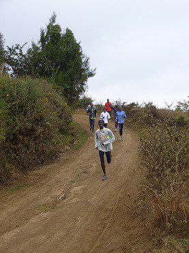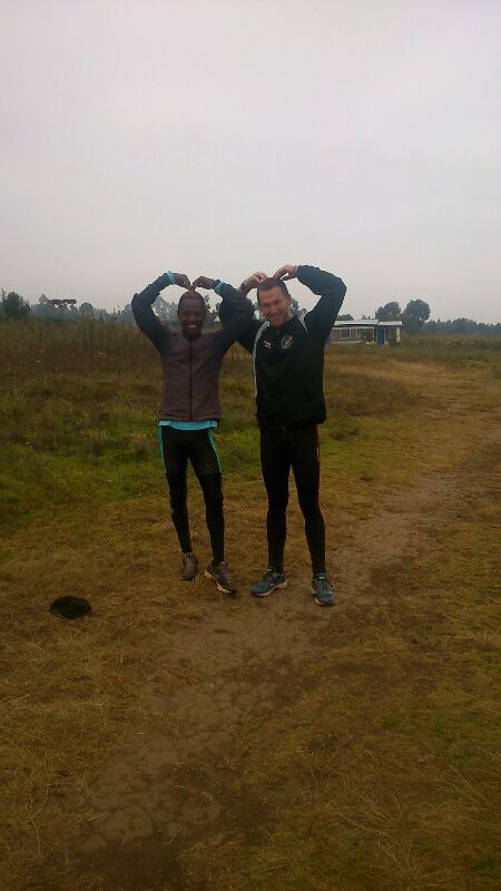Für mich selbst ging es erstmal gemütlicher los. Mein neuer Kumpane Benson (im übrigen ein verdammt cleverer 19jähriger Bursche, der über run2gether nun ab August für drei Jahre in Finnland eine Ausbildung machen darf) hat sich mir also angenommen und wir gingen zu Zweit das Ganze mit einem etwas gemächlicheren morning run um 6:30 an. Um ehrlich zu sein wäre auch nichts anderes als recht gemächliches Joggen für mich drin gewesen, denn die unheimlich holprigen Wege, das ständige auf und ab, und natürlich nicht zuletzt die Höhe (wir sind auf 2400m) fordern ihren Tribut… Doch schon ab dem zweiten Tag hat Benson die Sache angezogen und ich wurde getestet ob ich denn nicht wenigstens schon ” Longruns” mit den Athleten machen könne… Ich muss schon sagen dass die Kenianer wirklich sehr höfliche Menschen sind und einem doch immer wieder sagen dass man ” strong” sei, auch wenn man selbst bei seinem Laufpartner noch kaum ein Schnaufen oder eine Schweißperle entdecken kann :-)